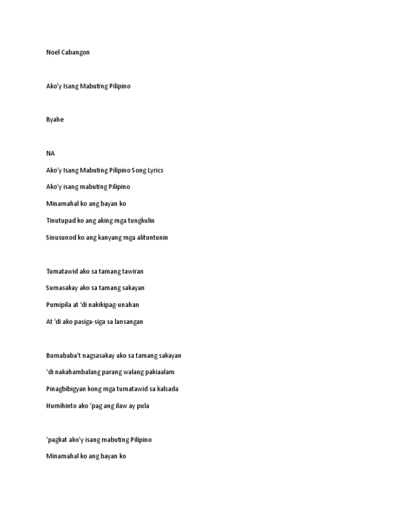 Akoy Isang Mabuting Pilipino by Noel Cabangon. Browse for Ano Ang Mensahe Ng Kantang Akoy Isang Mabuting Pilipino song lyrics by entered search phrase. Listen to Akoy Isang Mabuting Pilipino onlineAkoy Isang Mabuting Pilipino is a Tagalog language song and is sung by Noel CabangonAkoy Isang Mabuting Pilipino from the album Byahe was released in the year 2017The duration of the song is 621Download Tagalog songs online from JioSaavn.