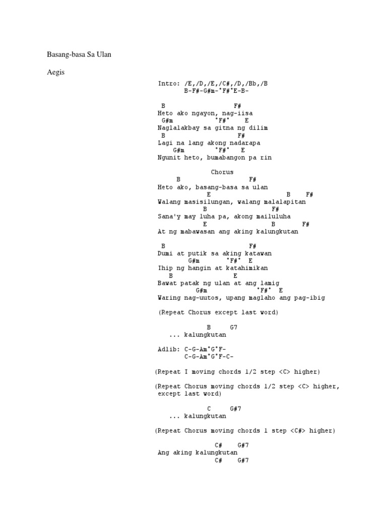 7252018 Verse 1 A E Heto ako ngayon nag-iisa Fm D Naglalakbay sa gitna ng dilim A E Lagi na lang akong nadarapa Fm D Ngunit heto bumabangon pa rin Chorus A E Heto ako basang-basa sa ulan D A E Walang masisilungan walang malalapitan E A E Sanay may luha pa akong mailuluha D A E At ng mabawasan ang aking kalungkutan Verse 2 A E Dumi at. Heto ako ngayon nag-iisa Naglalakbay sa gitna ng dilim Lagi na lang akong nadarapa Ngunit heto bumabangon pa rin Heto ako basang-basa sa ulan Walang masisilungan walang malalapitan Sanay may luha pa akong mailuluha At ng mabawasan ang aking kalungkutan Dumi at putik sa aking katawan Ihip ng hangin at katahimikan Bawat patak ng ulan at ang. 3242017 Chorus B F Heto ako basang basa sa ulan E B F Walang masisilungan walang malalapitan F B F Sanay may luha pa akong maiiluha E B G Bt ng mabawasan ang aking kalungkutan Solo Rhythm part C G Am G F C G Am G F Verse C G Heto ako ngayon nag iisa Am G D Naglalakbay sa gitna ng dilim C G Lagi na lang akong nadarapa Am G F Ngunit heto.