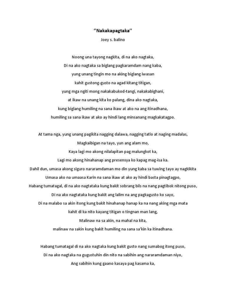 Diba nasakanya sakanya na mas pinili mong sumaya kahit hindi naman talaga Sana nung una palang sinabi mo na mahal mo talaga sya nang hindi na umasa. Read Minahal mo ba talaga ako. 1172017 SA MGA BAGAY NA- SPOKEN POETRY Noon ang sikip-sikip ng mundo Dahil sa pagmamahalan nating totoo Umuunti ang tao parang ikaw lang at ako Andito ka sa harap ko at ganun din ako sayo Naglalakad tayo at hawak mo ang kamay ko Bumabyahe tayo na nakasandal ako sa balikat mo Kumakain tayo ng mga paborito mo at paborito ko At natutulog tayo na palagi.
