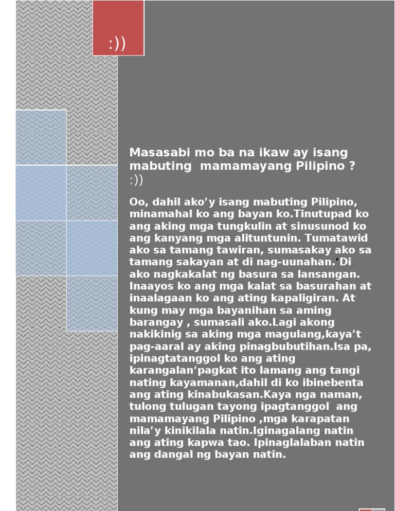 The best thing about these people is Ako Ay Isang Mabuting Pilipino Essay their customer service that did not let me down at all even though I have been pestering them every few hours even late in. About Press Copyright Contact us Creators Advertise Developers Terms Privacy Policy. Is a top-notch writing service that has continued to offer high quality essays research papers.